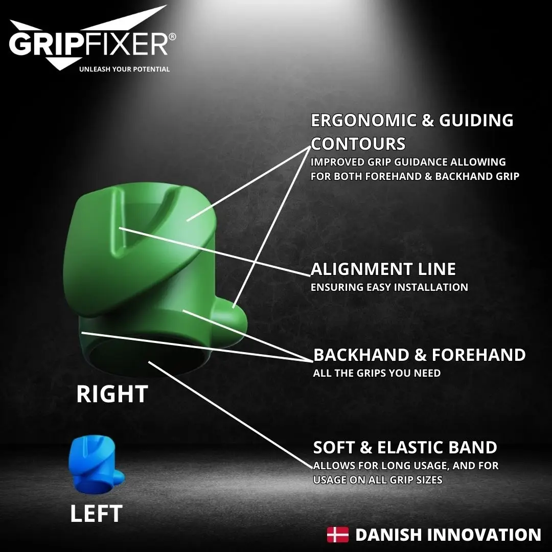 - SMART DESIGN | GripFixer is designed with the user in focus – so GripFixer can be attached in a matter of second – by everyone. GripFixer’s design allows you to switch between the grips (forehand and backhand grip), without having to stop and adjust the device manually. Therefore, you can use GripFixer continuously in regular play. The material is very soft, making it possible to use for extended periods of time. Furthermore, GripFixer is color-coded so it’s very easy to find the version you’re looking for – green is right hand, and blue is left hand.